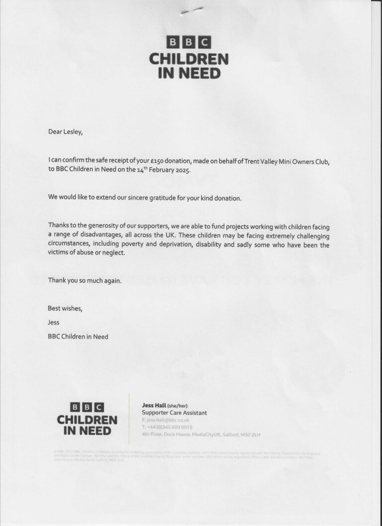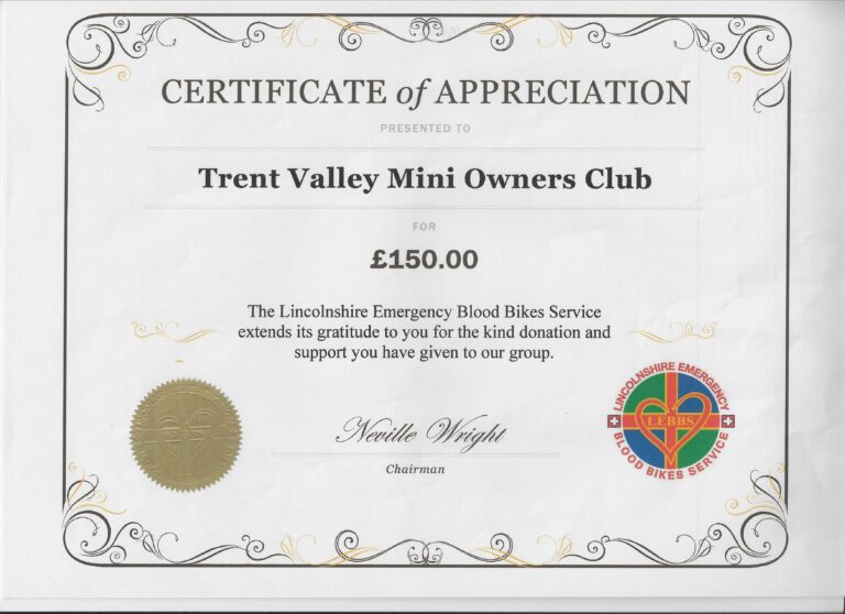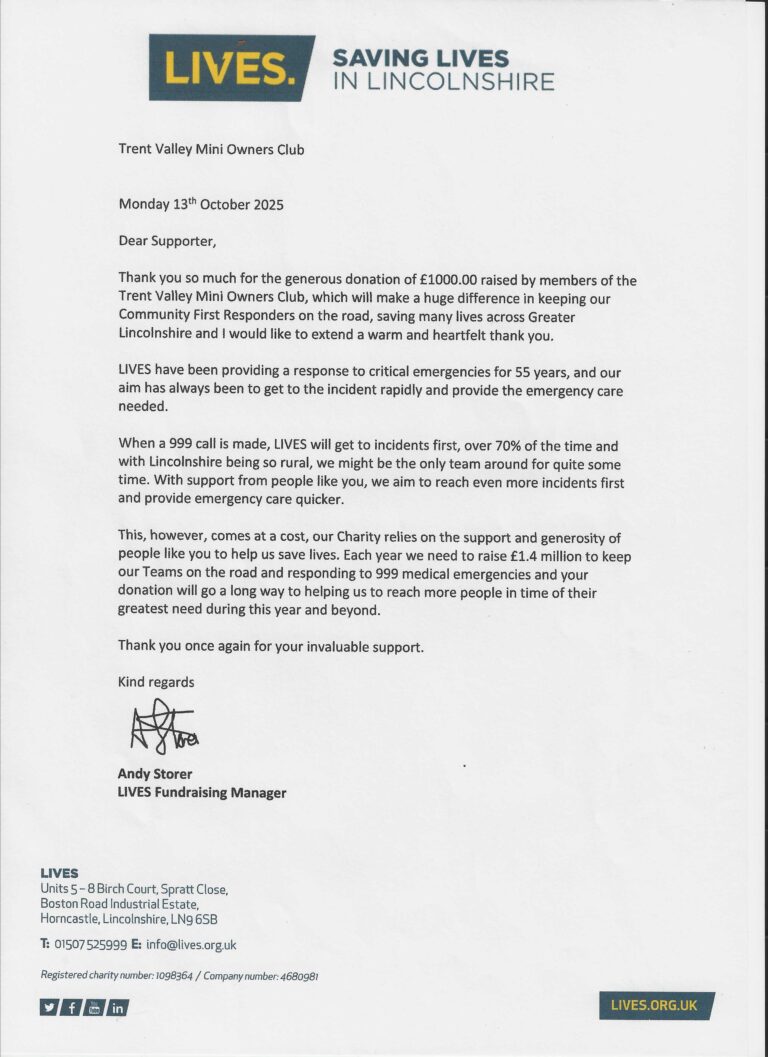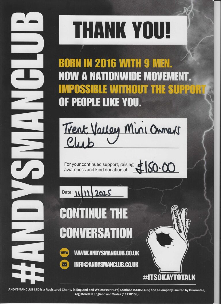 Trent Valley Mini Owners Club is very busy throughout the year, and many aspects of organising and attending various events allow us to donate some of our profits to local charities. 2025 was a particularly good year for the club and we managed, with the help of the public donations and contributions, to donate over £4000.00 to our charities.